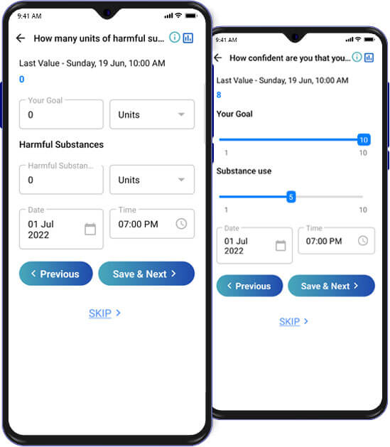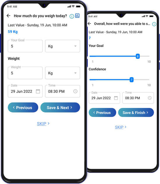 The final two questions are aimed at measuring your overall physical and mental progress. Your current weight is used to measure overall physical progress. To keep values in relative terms, Note that weight displays are converted to amount gained or lost from your initial weight value.